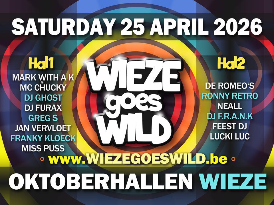 Wieze Goes Wild komt eraan en dat wil je absoluut niet missen! Op zaterdag 25 april nemen we de Oktoberhallen in Wieze volledig over voor een keihard feest met een line-up verspreid over twee stages, zodat je zelf kiest hoe wild jouw nacht wordt. Ga los in Hal 1 met de stevige beats van Mark With a K & MC Chucky en DJ Ghost, of trek naar Hal 2 om luidkeels mee te zingen met De Romeo’s en te stampen op de classics van Ronny Retro.